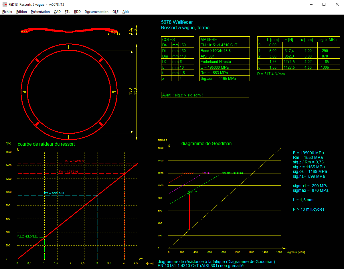 - Visualisation générale des résultats, extrait, caractéristiques progressives de la courbe du ressort, diagramme de Goodmann, cours de la tension, diagramme du taux et du travail du ressort