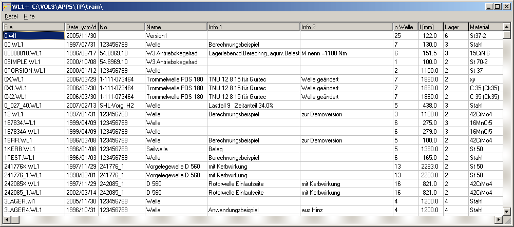 Eine Voransicht als Tabelle gibt es jetzt auch im Wellenberechnungsprogramm WL1+ und im Trägerberechnungsprogramm TR1. Anders als in den anderen Programmen wird beim Öffnen der Dateien keine Berechnung durchgeführt. In der Voransicht-Tabelle werden deshalb nur Eingabedaten gelistet, keine Berechnungsergebnisse. Dies geschieht aus Zeitgründen, bei mehrfach gelagerten Wellen müsste man lange auf die Voransicht-Tabelle warten. Um die Welle oder den Träger zu berechnen, wählt man einfach die gewünschte Datei und Quick-Ansicht, Ausdruck oder das gewünschte Diagramm.