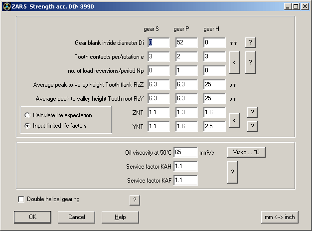 Concerning life time factors YNT and ZNT, calculation method in ZAR1+ and ZAR5 differs from ISO 6336 and DIN 3990. According to DIN and ISO, you have to determine the life time factors YNT and ZNT from the required life time. If life time must be infinite (fatigue life), YNT and ZNT are set 1.0. ZAR1+ and ZAR5 calculate reverse: if calculated safety coefficients SH and SF are higher than 1, gear is fatigue-resistant. If SH and SF are lower than 1, program calculates life expectancy.