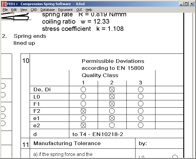 New version of FED1+ and FED6 lets you select different quality grade for loads F1 and F2 as well as for parallel and angle deviation e1 and e2. Quality grades are listed in production drawing according to EN 15800, which replaces form in DIN 2099-1. Coil ratio w and stress correction coefficient k also have been added to the production drawing.