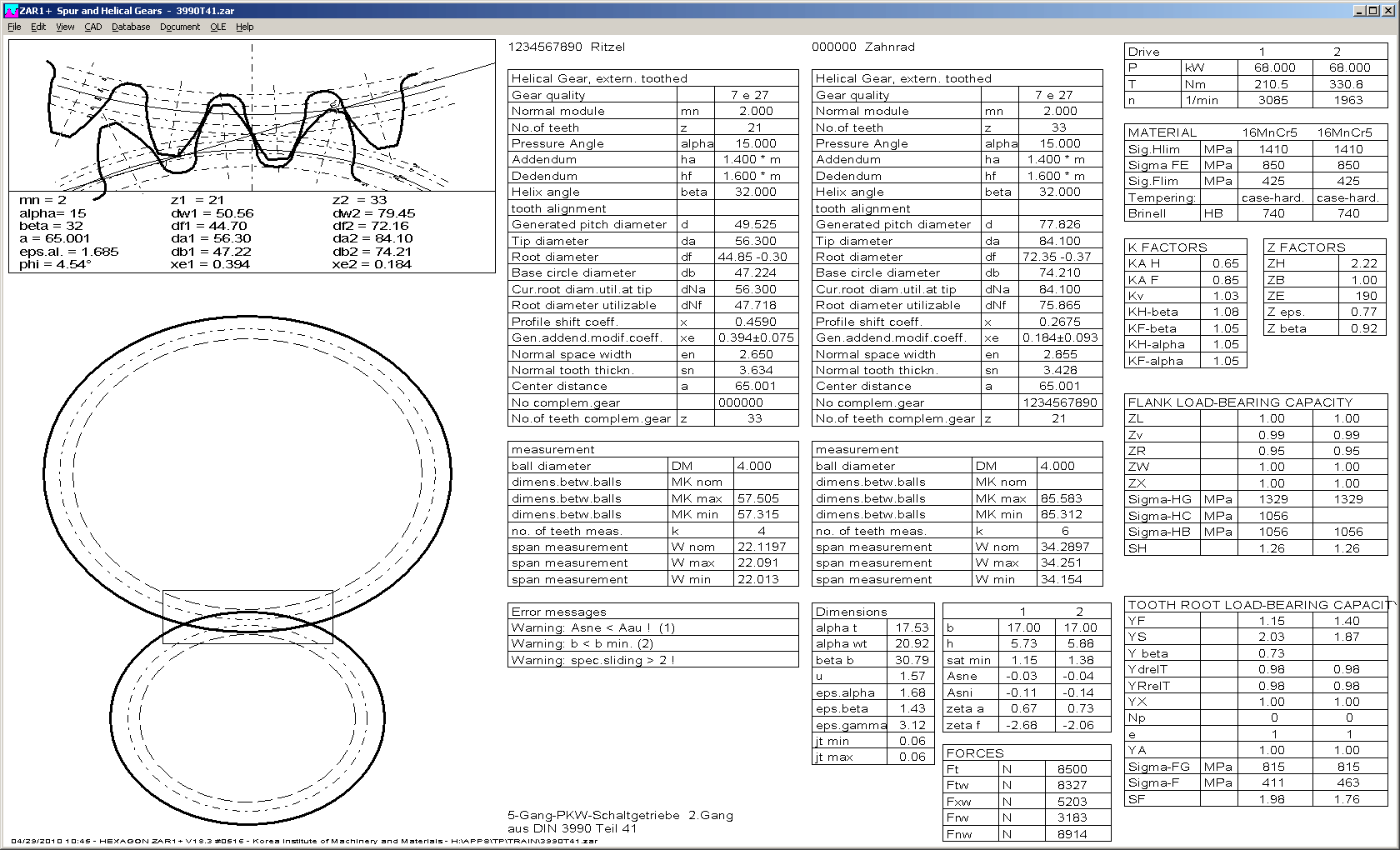 New Quick3 View in ZAR1+ shows drawing of gears and tooth contact together with tables of essential dimensions, measurement, load, material and strength data on one screen.