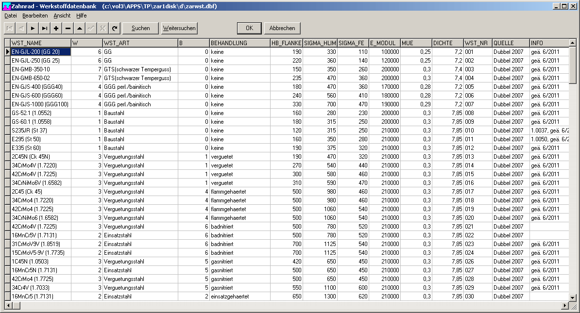 Die meisten Werkstoffdaten in der Datenbanken zarwst.dbf stammen aus "Dubbels Taschenbuch Maschinenbau" und "Niemann Maschinelemente", siehe Feld "Quelle". Die Daten aus "Dubbel" wurden an die Daten in der neuesten Auflage 22 (2007) angepasst. Die bisherigen Daten stammten aus der 15. Auflage 1983. Die Werte von SigmaHlim und SigmaFE sind in der neuen Auflage oft höher, aber manche auch niedriger als bisher. Im Dubbel werden vielfach Streubereiche mit min- und max-Werten angegeben. In die Datenbank werden konservativ die niedrigsten Werte der zulässigen Spannungen übernommen.