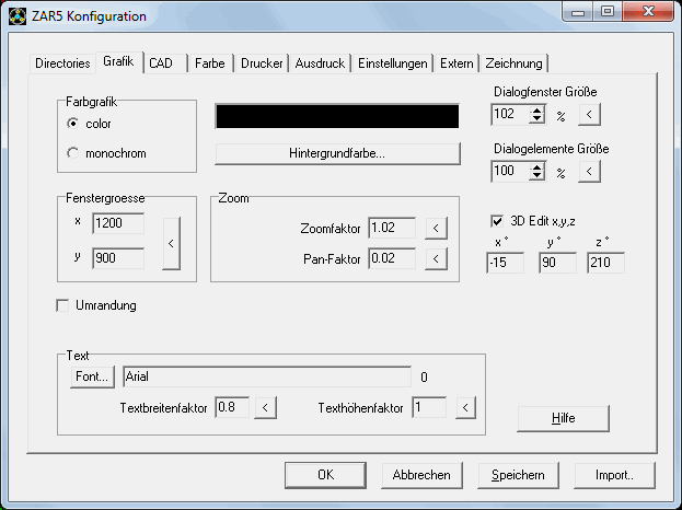 Da immer mehr die überbreiten Flachbildschirme eingesetzt werden und die Standardeinstellung bei Installation so ist, daß der gesamte Bildschirm ausgefüllt wird, werden Zeichnungen zwangsläufig in die Länge gezogen, und Kreise leicht elliptisch dargestellt. Um diesen Effekt zu korrigieren, in der Konfiguration unter "Datei->Einstellungen->Grafik" Fenstergröße x = 1.33 * y berechnen, eingeben und speichern. Der Ausdruck auf Drucker ist normalerweise unabhängig von der Bildschirmeinstellung. Wenn es hier Verzerrungen gibt, können Sie im Druckerfenster "Maßstab x" oder "Maßstab y" entsprechend verkleinern. Oder noch besser mit unsere Zusatzsoftware DXFPLOT maßstäblich ausdrucken, wenn der Drucker PCL5 oder PCL6 versteht.