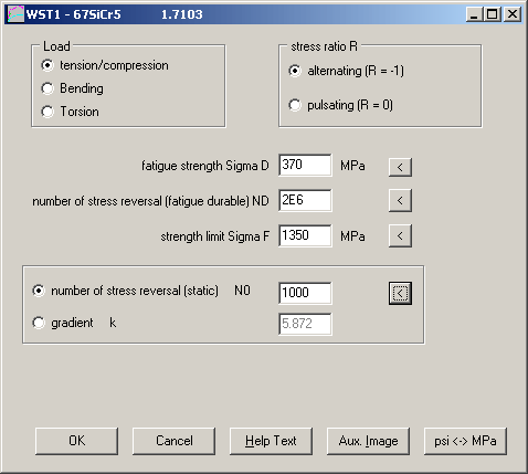 In WST1, you can now create a simple SN diagram. First select load case (tension, bending, torsion) and stress ratio (alternating load, pulsating load). Then you can use "<" buttons to set fatigue strength Sigma D and static strength from material database (if available). ND is set 2E6, and N0=1000 by default.