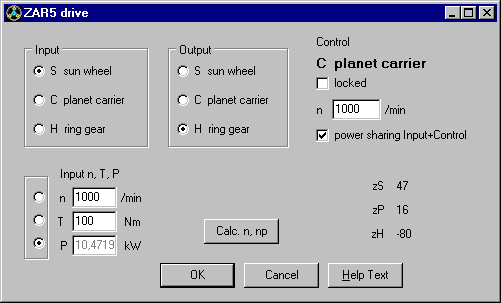If input shaft and control shaft are connected (i=1, n control = n input). Planet gear speed relative to carrier is 0 (npc=0). Fatigue strength of gear wheels could not be calculated in this case. Since release 10.0, ZAR5 calculates SH and SF as static safety coefficients from torque.