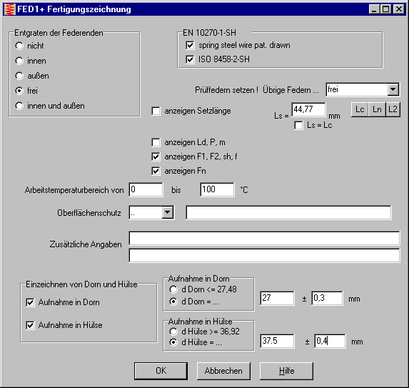 Da die Formel im Programm geändert wurde, erhalten Sie jetzt geringfügig geänderte Daten für Ihre früher berechneten Federn, falls eine andere Arbeitstemperatur als 20°C verwendet wurde. Wenn Sie alte Dateien mit FED1+ öffnen, wird die Windungszahl angepasst, Federkräfte bleiben unverändert. Bei FED2+ ändert sich der Windungsdurchmesser, bei FED3+ die Windungszahl und delta0, bei FED5, FED6 und FED7 ändern sich die Federkräfte.