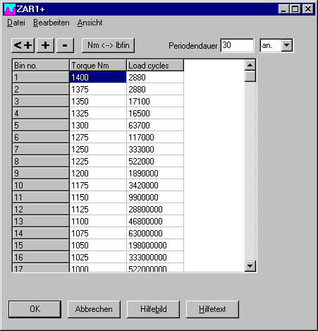 ZAR1+,ZAR2,ZAR5,ZAR6,ZAR7,ZAR8: Eingabe Lastkollektiv mit Drehzahlen