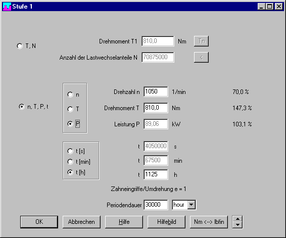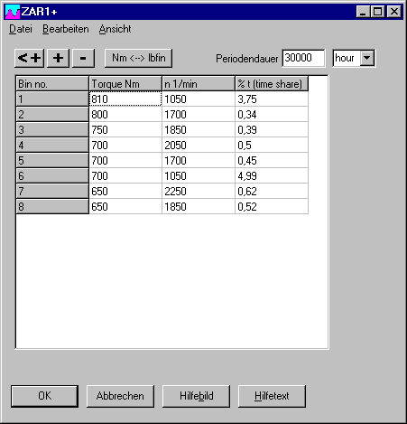 Bei der Eingabe "n,T,P,t" werden die Eingaben umgerechnet auf die Anzahl der Lastwechselanteile. Die eingegebenen Daten wurden bislang nicht gespeichert, es kann auch nicht aus der Anzahl der Lastwechselanteile auf n,T,P,t zurückgerechnet werden. Jetzt wird für jede Klasse des Lastkollektivs zusätzlich die Drehzahl gespeichert. Wenn nichts angegeben ist, wird die Nenndrehzahl gespeichert.