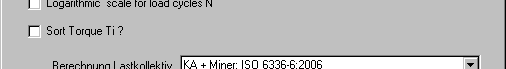 Neu ist die Eingabe der Periodendauer für das eingegebene Lastkollektiv. Damit hat man die Möglichkeit, Stillstandszeiten einzugeben. Die Stillstandszeit wird nicht direkt eingegeben wie in ISO 66336-6, sondern aus der Differenz von Periodendauer bzw. Gesamtlaufzeit und Summe der Zeitanteile im Lastkollektiv berechnet. Die Periodendauer ist idealerweise die geforderte Gesamtlaufzeit, wenn zuvor die Lastspielzahlen über die Lebensdauer eingegeben wurden. Die Periodendauer kann aber auch z.B. eine Stunde oder 1 Tag sein, wenn die Zeitanteile der Drehmomentklassen für eine Periode (Lastzyklus) eingegeben wurden. Wenn man 0 eingibt oder die eingegebene Periodendauer kleiner ist als die Summe der Zeitanteile Lastkollektiv, wird die Periodendauer als Summe der Zeitanteile des Lastkollektiv gesetzt, die Stillstandszeit ist dann 0.