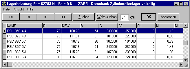 Für vollnadelige Lagerung wird das Spiel zwischen den Rollen (Teilkreisendspiel TES = 5E-3 Z) vom Programm berechnet (nach Schaeffler). Daraus ergibt sich dann der Laufbahndurchmesser von Welle und Bohrung bzw. von Planetenbolzen und Planetenrad. Um die Wälzlager wie gewohnt aus Datenbank wählen zu können, wurden für Wälzrollen von 1mm bis 6mm mit Breiten von 5.8mm bis 39.8mm und 10 bis 50 Wälzkörpern die Laufbahndurchmesser, Tragzahlen C und C0 und Masse berechnet. Das ergibt dann eine Datenbank mit 2500 Datensätzen.