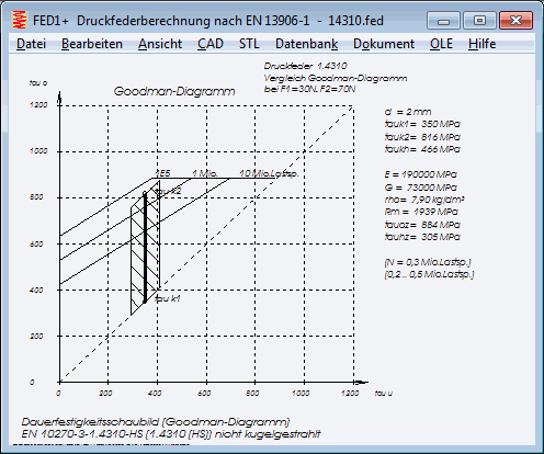 Example calculation with F1=30N and F2=70N shows the difference by means of the Goodman diagram: spring made of 1.4568 is fatigue strength safe, but spring made of 1.4310 fails after 300,000 strokes.