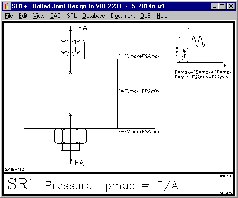 SR1+ calculates more precise. Outside the selected clamping plates of load introduction, maximum pressure is calculated with FSAmax, and inside FA introduction positions without FSAmax (in assembly state). In case of compressive load, outside the load introduction positions, formula according to VDI 2230 is valid (with FSA=0). But inside the FA position, compressive load share FPA must be added. pBmax = (FVmax – FPAmin – deltaFVth) / Apmin (with FPAmin < 0)