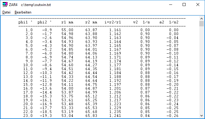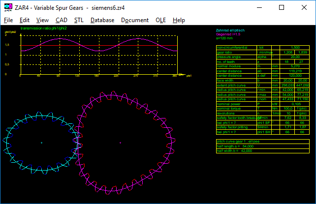 For circulating nonlinear gears, the total transmission ratio must be 1 or 2 or larger integer. If only a sector of the nonlinear gear is used, e.g. for a control lever, then this restriction can be reduced, the total transmission ratio can then have any value. This case can now also be calculated in ZAR4, for this case choose "gear pair non-circumferential" and enter number of teeth of the counterwheel. Tooth profile is not closed at phi = 360 ° and matching teeth no longer run together. But there are also exceptions: if the pitch curve of gear 1 is symmetrical, the gear pair is also running if the total transmission ratio is 1.5 or 2.5.