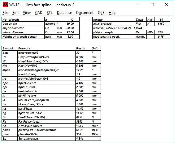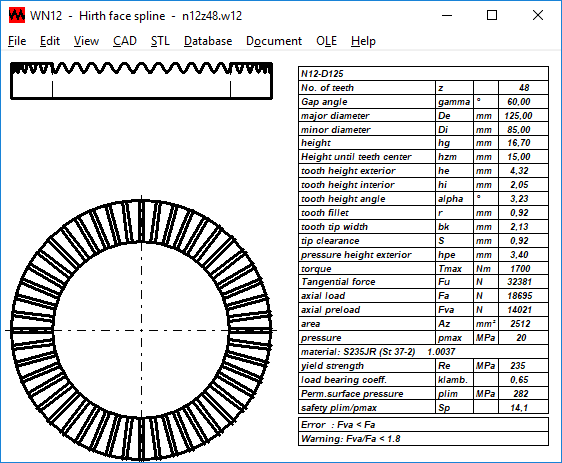 WN12 calculates the surface area, surface pressure and safety factor from torque, preload and material data. The tooth drawing is generated by the program and can be exported to CAD. A model of a ring with face spline can be made with 3D printers, WN12 generates an STL file for it.