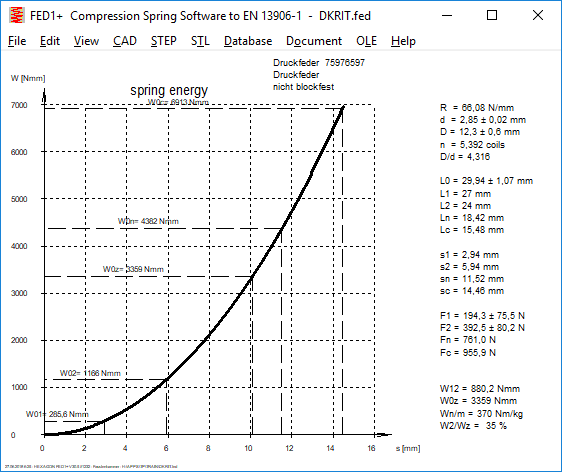 In the spring programs a new factor is introduced: energy-mass-ratio (W0n/m) as indicator, how much energy can be stored with 1 kg of spring material. This allows you to compare different spring types, materials and cross-sectional shapes. Therefore, "Wn/m" is also included in the table under "File-> Open Table".