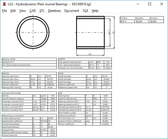 New in LG2 are Quick3 View and Quick4 View with drawing of the journal bearing and tables with dimensions and calculation results altogether on one screen (print with Ctrl-P or File\Print)