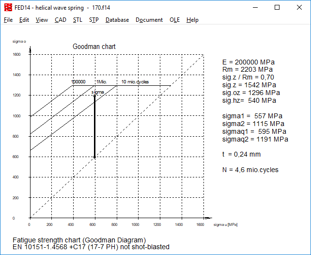 For spring steel strip according to EN 10132-4 from the material database fed9wst.dbf a Goodman diagram is now displayed. The fatigue data is available from DIN 2093: 2013-12 for disc springs.