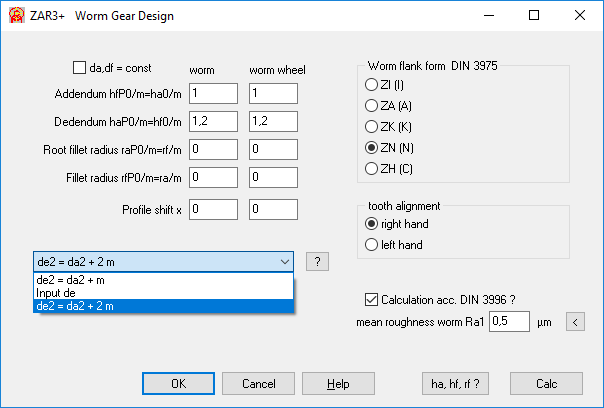 The outer diameter de2 of the worm wheel can be entered directly or can be calculated with "de2 = da2 + mt2". The tangential modulus mt2 of the worm wheel is the axial modulus mx1 of the worm, usually designated only as modulus m. Now you can also calculate "de2 = da2 + 2 m". Since the recommended tooth width b2 of the worm wheel is also based on de2 = da2 + 2m, this is the new default setting.