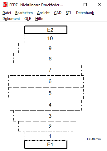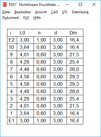 FED7 kann man auch verwenden, um in Reihe geschaltete Druckfedern zu berechnen. Für die Berechnung der Blocklänge kann man die Druckfedern in 2 oder 3 Abschnitten eingeben: Endwindungen unten/oben und federnde Windungen. Endwindungen mit L0i=nE*d, allerdings kann man nicht unterscheiden zwischen angelegten und geschliffenen Windungen, deshalb ist die FED7-Berechnung hier nicht ganz genau.