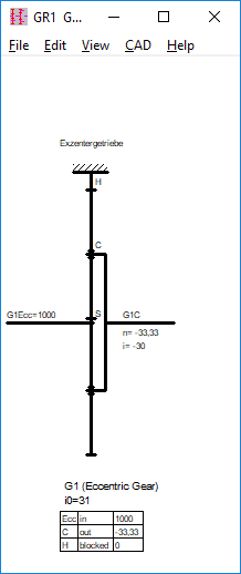 In die Getriebebaukasten-Software GR1 wurden Exzentergetriebe aufgenommen. Die Relativgeschwindigkeiten kann man ähnlich berechnen wie bei einem Planetengetriebe. Das Wälzrad ist das Planetenrad, die Exzenterwelle das Sonnenrad, der Bolzenteller ist der Steg, das Hohlrad gleich wie beim Planetengetriebe. Die virtuelle Zähnezahl des Sonnenrads ist die negative Zähnezahldifferenz: zS = zH + zP. Das Übersetzungsverhältnis bei blockiertem Steg ist i0 = zH/zS = zH/(zH+zP). Die Standübersetzung i0 ist positiv, wie bei einem Plus-Planetengetriebe.