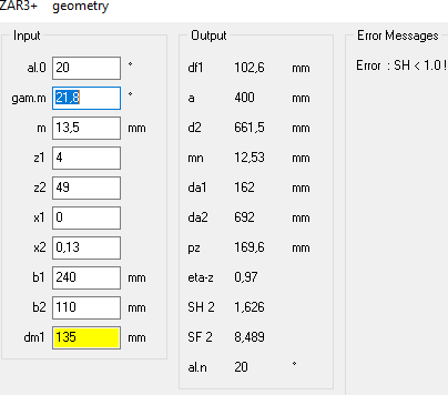 If you enter the module at "Dimensioning", dm1 and gamma_m are recalculated. If you want integers or standardized dimensions for m as well as for dm1, the profile shift x2 is calculated first. If -0.5> x2 <1.0, x2 is set, otherwise dm1 and gamma_m are recalculated as before.