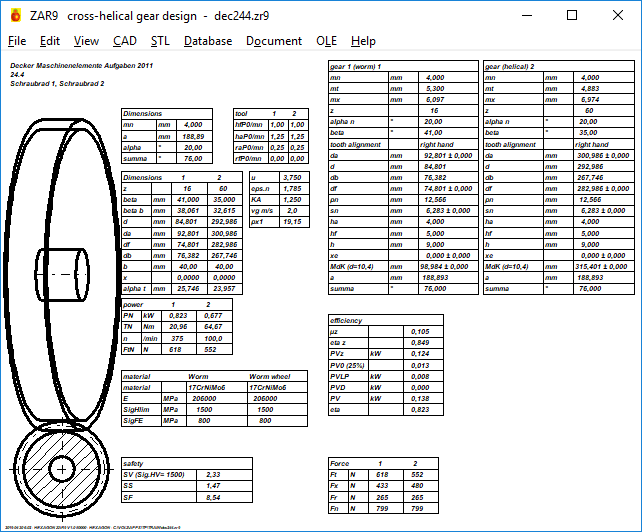 Soon we can provide a new software for cross-helical gear design. The dimensions of cross-helical gears are calculated similarly to worm gears, so that most dimensions for 90 ° axis angles can also be calculated with ZAR3 +. Instead of a line contact like a globoid worm wheel, there is only one point touch on the cross-helical gear. Therefore, in the cross-helical gear compared with a worm gear of the same dimensions, the load capacity is worse and the efficiency similarly poor.