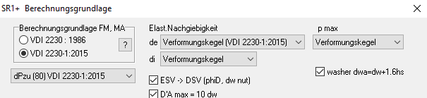 Unter "Berechnungsmethode" kann man jetzt mit "di Verformungskegel" die Bohrung in Klemmplatten als Verformungskegel statt als Zylinder bei der elastischen Nachgiebigkeit berechnen. Wenn man Klemmplatten mit normgerechten Bohrungen verwendet ist das uninteressant, das Ergebnis bleibt immer dasselbe. Nur wenn man mehrere Klemmplatten mit wechselndem Innendurchmesser oder Langloch verwendet, ändert sich die elastische Nachgiebigkeit deltaP. Statt dem Innendurchmesser der Klemmplatte wird dann ein Kegel aus den inneren Anlagedurchmessern der benachbarten Klemmplatten verwendet.