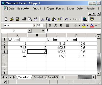 Bei der Eingabe der Abmessungen von nichtlinearen zylindrischen Druckfedern mit FED7 kann man für jeden Windungsabschnitt Windungszahl, Federlänge, Windungsdurchmesser und Drahtdurchmesser variieren. Für die Eingabe gibt es 3 Möglichkeiten: einzeln, in einer Tabelle, oder extern mit Microsoft Excel.
