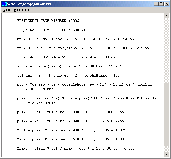 Dann gibt es noch einen neuen Ausdruck "Detail Festigkeit Niemann" mit den Formeln zur Festigkeitsberechnung, gerechnet mit den aktuellen Daten (zum Nachrechnen und Vergleichen).