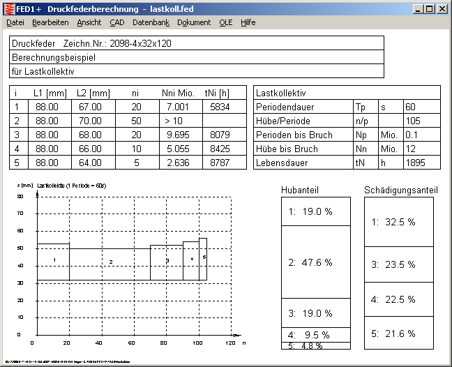 Neben Tabellen von Lastkollektiv und Berechnungsergebnissen werden in der Ansicht Hubanteil und Schädigungsanteil der einzelnen Lasten grafisch dargestellt.