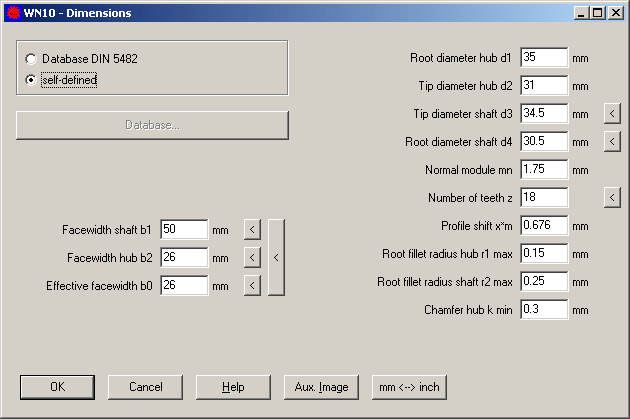 Another application of WN10 is the design of self-defined, non-standardized profiles. Input data are: module, number of teeth, root and tip diameters of internal and external spline, addendum modification. Compared with WN2, WN4 or WN5, you have more design possibilities in WN10, because tooth height factors are calculated variable.