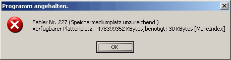 Bei Datenbankzugriffen erzeugen die Programme eine Index-Datei (NDX) im Temporären Ordner. Dabei wird vorher geprüft, ob genügend Speicher zur Verfügung steht. Wenn der freie Speicher größer als 2^30 kB (ca. 1000 GB oder 1 TeraByte) ist, kam es bisher zu einem Integer-Überlauf mit der Fehlermeldung 227 (unzureichender Speicherplatz). In neuen Versionen ab 11.10.2007 tritt der Fehler nicht mehr auf. Bei älteren Versionen muß für Temporär-Ordner (und evtl. auch Datenbank-Ordner) unter Datei->Einstellungen ein kleineres Laufwerk konfiguriert werden. Vorzugsweise z.B. C:\temp auf der lokalen Festplatte. Bei Netzwerkversionen ist es sowieso sinnvoll, als Temporär-Ordner kein Netzlaufwerk zu verwenden, um nicht mit temporären Dateioperationen das Netz zu belasten und die Anwendung unnötig zu verlangsamen.