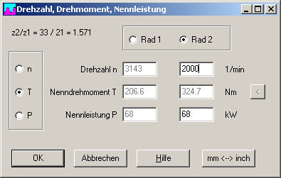 Alternativ zu den Antriebsdaten kann man jetzt auch Drehzahl und Drehmoment vom Abtriebszahnrad 2 eingeben, dann werden die Daten von Rad 1 (Antrieb) berechnet.