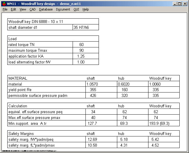 New WN11 Software calculates load bearing capacity of Woodruff key joints according to DIN 6892. This standard is specified for parallel keys, but can also be used for Woodruff keys, if load-bearing length and load-bearing height are replaced by load-bearing areas of shaft groove, hub groove and Woodruff key.