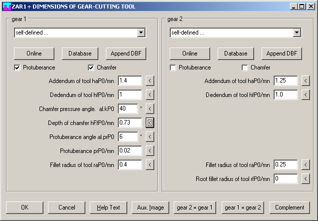 Input window for tool profile dimensions was made more clear and easy. If not checked "Protuberance" and "chamfer", only required input fields for addendum, dedendum and fillet radius are displayed. Root fillet radius of tool can be entered only if no chamfer defined. Another new feature are the suggest buttons for default input. A mouse click into "<" at fillet radius raP0/mn calculates maximum tooth fillet radius. Remember that addendum of tool generates dedendum of tooth and vice versa.