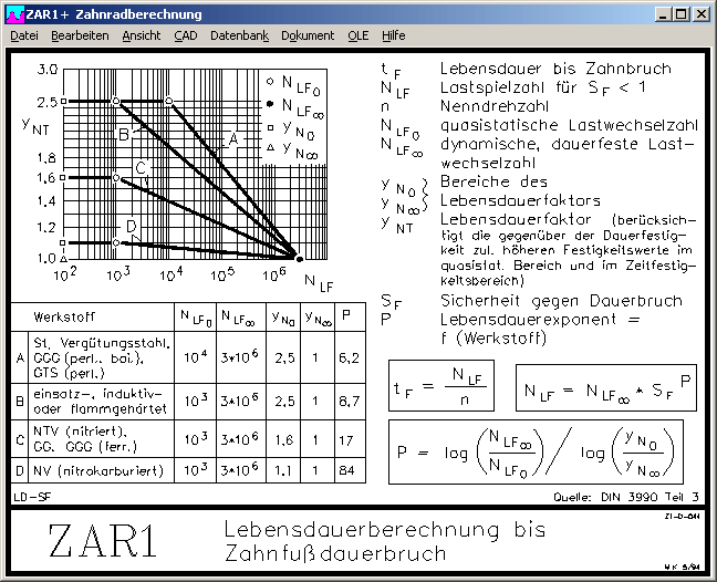 Bezüglich der Lebensdauerfaktoren YNT und ZNT unterscheidet sich die Vorgehensweise in ZAR1+ und ZAR5 von ISO 6336 bzw. DIN 3990. Während nach DIN und ISO aus der Lebensdauer Diagrammwerte für YNT und ZNT ermittelt werden, geht ZAR1+ und ZAR5 den umgekehrten Weg: Bei Sicherheit S>=1 ist das Zahnrad dauerfest, und bei SH und SF kleiner 1.0 wird die Lebensdauer berechnet.
