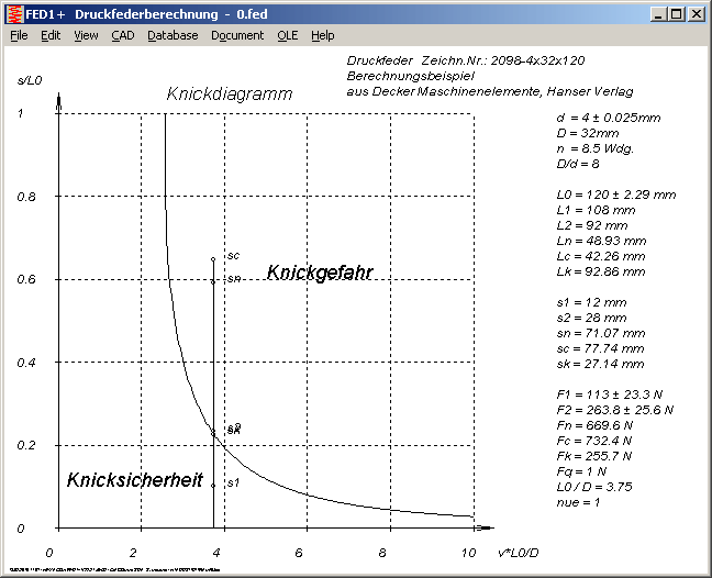 Wenn man für Querfederweg und Querfederrate negative Werte erhält, knickt die Feder aus. Dies kann man leicht im Knickdiagramm nachvollziehen (nue=1!): Wenn s2 nahe an der Grenze zur Knickzone liegt, wird der Querfederweg sq2 sehr groß. Für s2=sk ist sq2 unendlich groß, und wenn s2 in der Knick-Zone liegt (s2>sk) wird sq2 negativ.