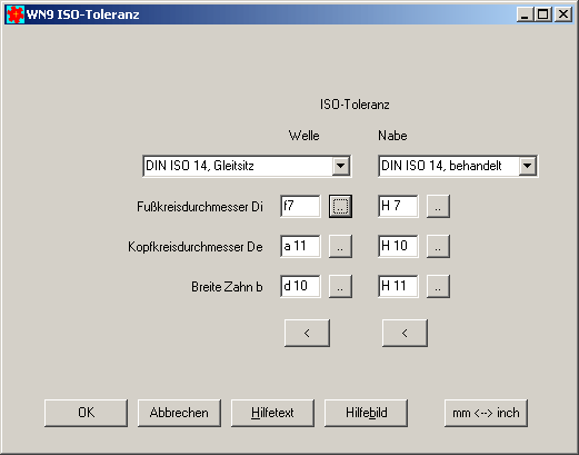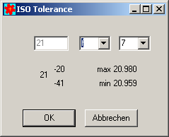 Mit dem .. Knopf wird ein Fenster zum Auswählen der ISO-Toleranz eingeblendet. Die möglichen Toleranzfelder kann man auswählen, Toleranz und min/max-Wert werden angezeigt.