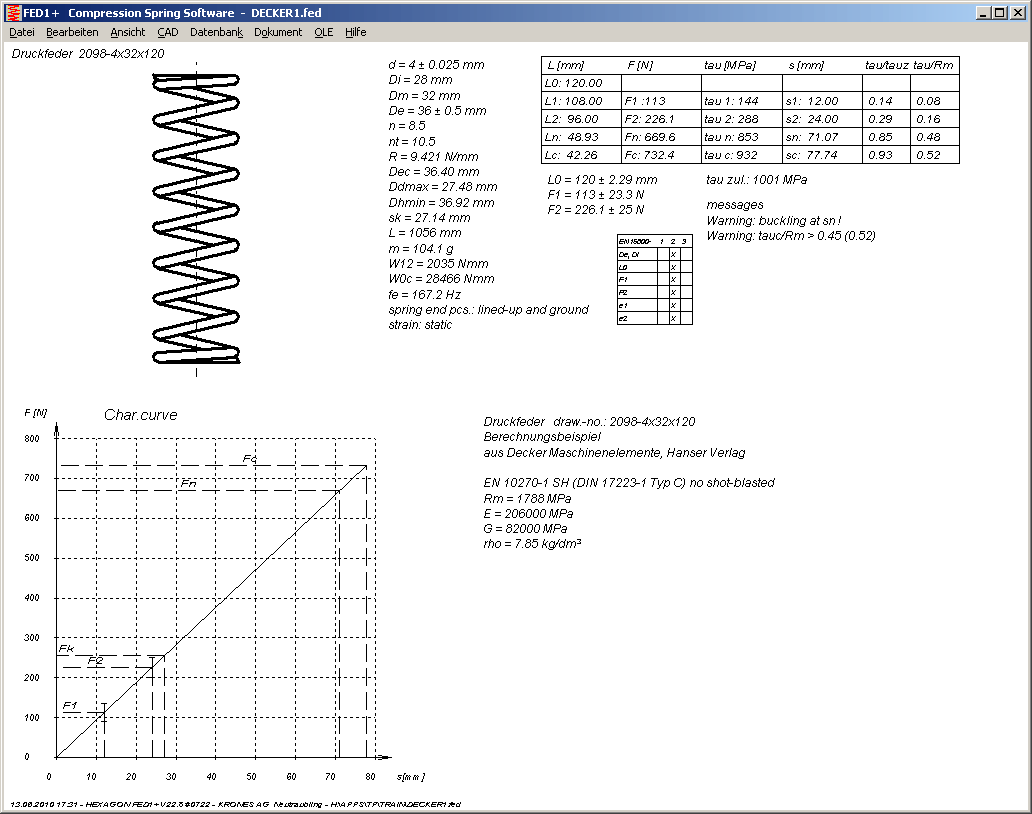 Die maximale Federenergie (zwischen ungefederter Länge L0 bis Blocklänge Lc) wird mit ausgegeben. Verglichen mit der Federarbeit W12 (zwischen L1 und L2) kann man die Ausnutzung der Feder beurteilen.