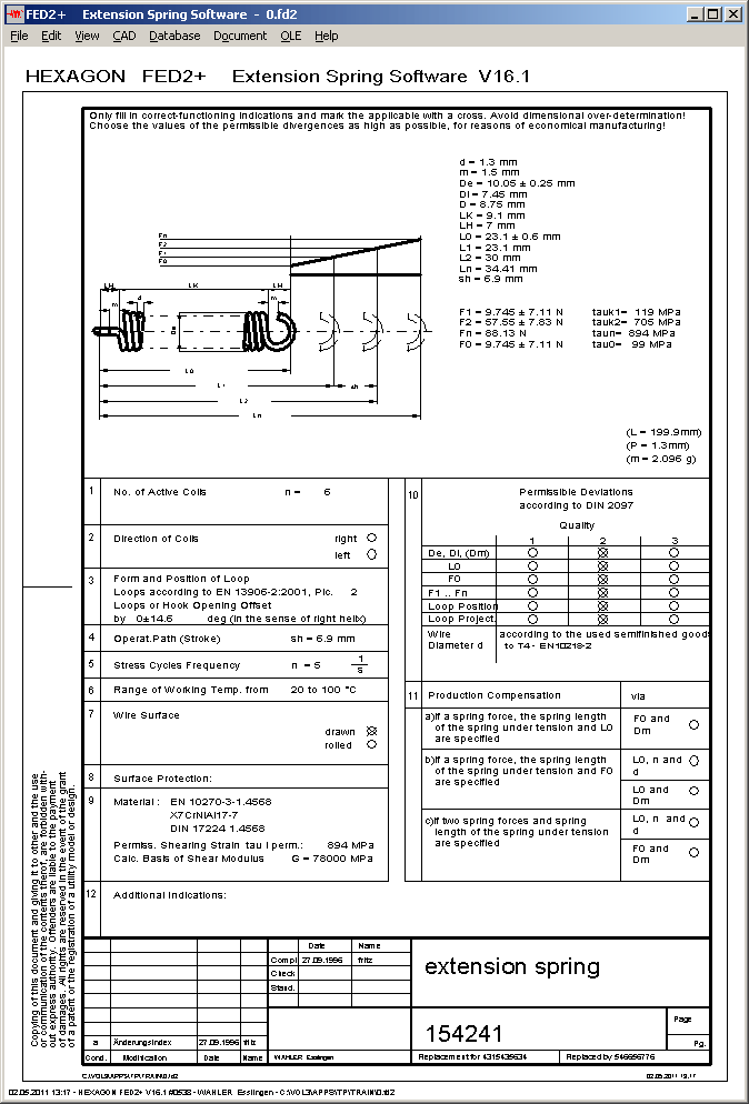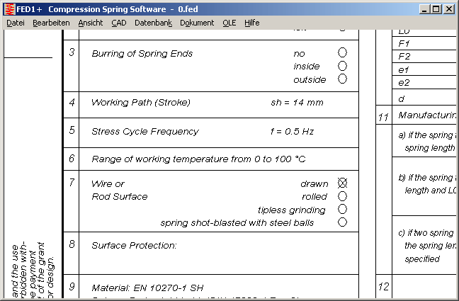 As alternative to View->Production drawing, another similar production drawing according to DIN 2099-2:2004 can be generated now. Differing from the DIN standard, load cycle frequency is printed in 1/s instead of 1/min, as specified in the EN 15800 standard for compression springs.
