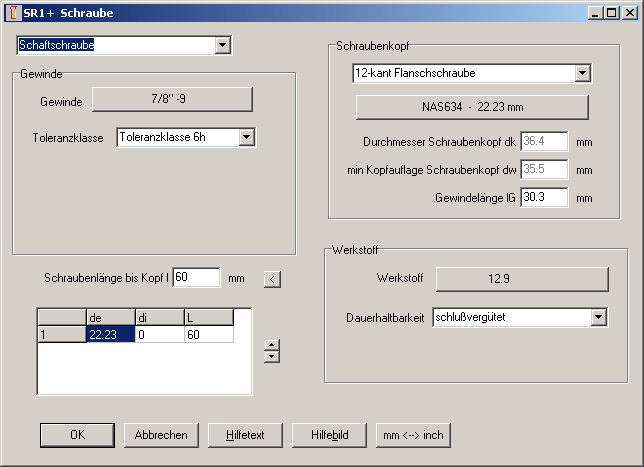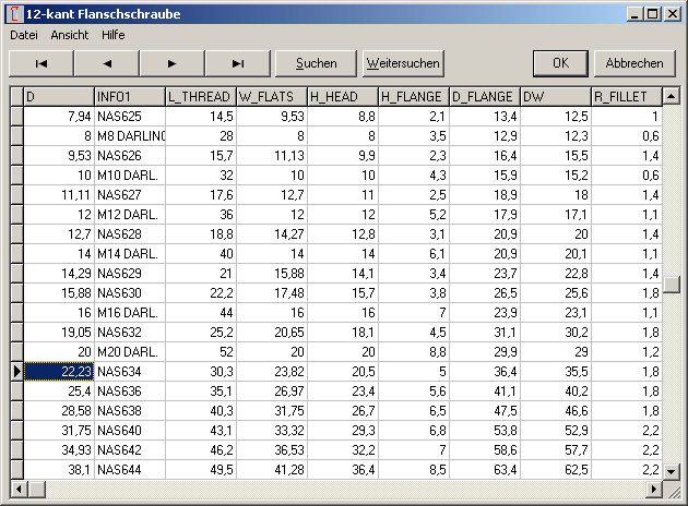 Aufgenommen wurden Abmessungen nach US-Normen NAS624 bis NAS644 (National Aerospace Standards) und Military Standard MS21250, sowie metrische Größen M6 bis M20 nach Unterlagen von Darling Bolt.