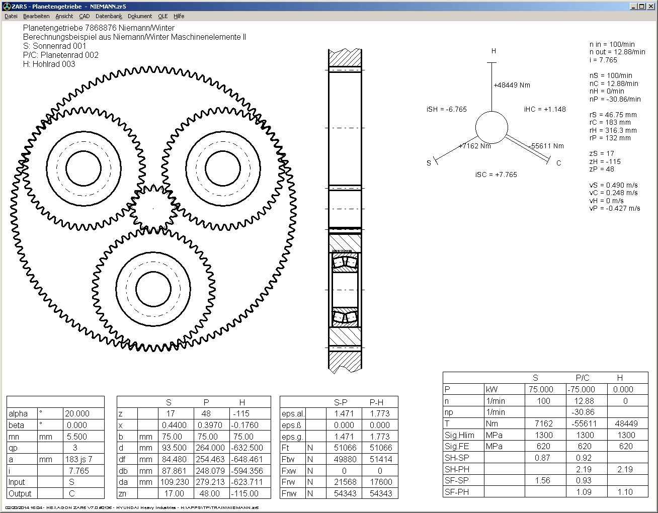 Die neue Quick3-Ansicht in ZAR5 enthält eine Zeichnung des Planetengetriebes in Vorder- und Seitenansicht, Schema der Leistungsverzweigung nach Wolf, dazu Tabellen mit Abmessungen und Festigkeit von Sonnenrad (S), Planetenrad (P) und Hohlrad (H).
