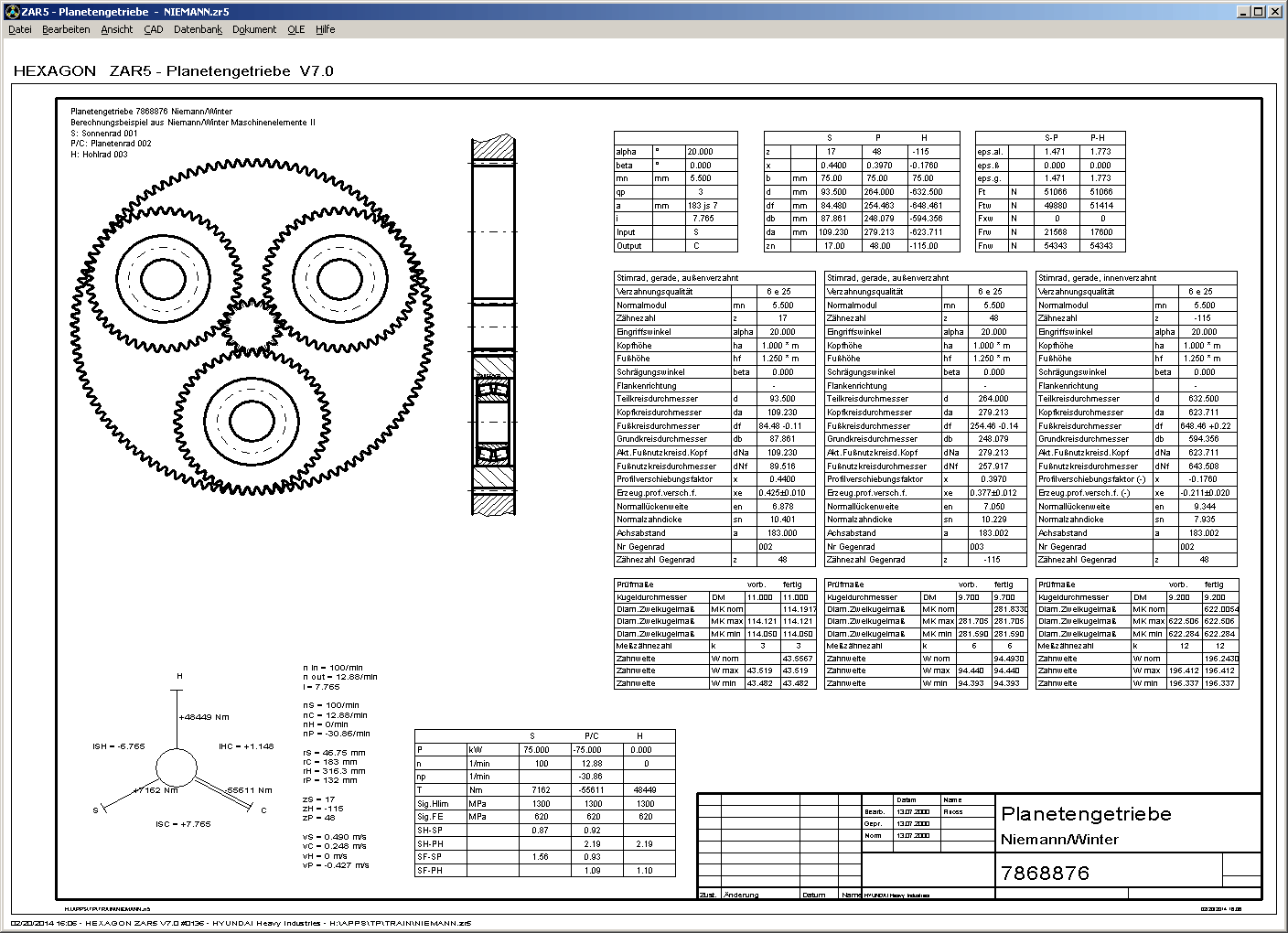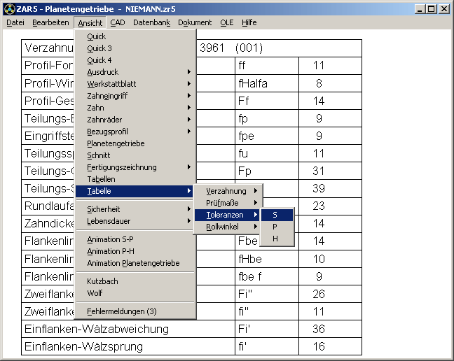 Tabellen von Verzahnungsdaten, Prüfmaßen, Toleranzen und Rollwinkel für Sonnenrad, Planetenrad und Hohlrad wurde in Ansicht->Tabelle aufgenommen.