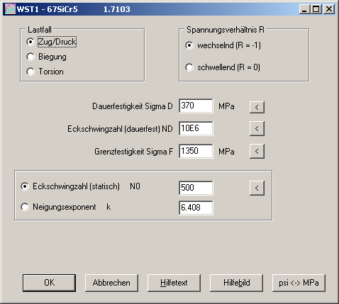 In WST1 kann man jetzt ein einfaches Wöhler-Diagramm konstruieren. Zu wählen sind Lastfall (Zug, Biegung, Torsion) und Spannungsverhältnis (wechselnd, schwellend). Mit den "<" Buttons werden Dauerfestigkeit Sigma D, je nach Auswahl Wechselfestigkeit oder Schwellfestigkeit bei Zug/Druck, Biegung oder Torsion und Grenzfestigkeit (statische Festigkeit) aus den Werkstoffdaten übernommen (sofern vorhanden). Für die Eckschwingzahl ND wird 2 Mill. eingesetzt. Für die Eckschwingzahl N0 werden 1000 Lastspiele gesetzt. Alternativ kann man auch den Neigungskoeffizient k eingeben. Laut Issler/Ruoß/Häfele (Festigkeitslehre Grundlagen, Springer ISBN 3-540-57995-8) verläuft die Wöhlerlinie für nichtgekerbte Proben relativ flach (k=10 bis 15), bei mittlerer Kerbwirkung k=6 bis 10, und bei hoher Kerbwirkung k=4 bis 6.