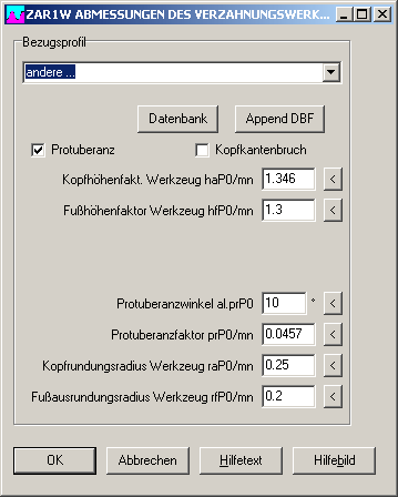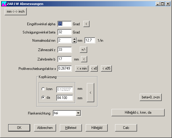Die Abmessungen eines Zahnrads kann man auch mit ZAR1 statt ZAR1W berechnen. In ZAR1 muss man aber immer ein Zahnradpaar eingeben. Die Eingabe eines Gegenrads entfällt in ZAR1W, dafür kann man keine Festigkeit berechnen.