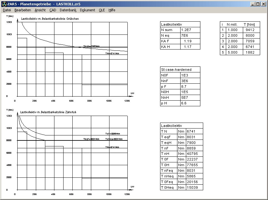 In ZAR5 kann man jetzt ähnlich wie in ZAR1+ ein Lastkollektiv eingeben. Dabei definiert man die Drehmomente an der Eingangswelle und die zugehörigen Umdrehungen der Welle. Also nicht die Lastspiele, weil dies beim Planetengetriebe am Sonnenrad und Hohlrad von der Anzahl der Planetenräder abhängt, und bei den Planetenrädern wechselnde statt schwellende Last auftritt. Dies ist aber bei der Festigkeitsberechnung bereits berücksichtigt.
