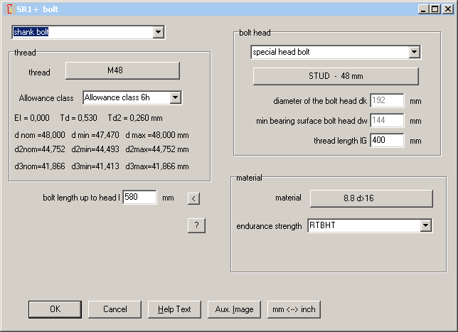If you selected "special bolt head" in the past, maybe you got a message "D=xx not found – Append dbf", and you first had to define the bolt head data in the "sondkopf" database. Now, for all thread sizes a "special bolt head" was defined with head height h =3d, external diameter de=4d, and bearing diameter dw=3d. Such a bolt head can be used if a stud instead of a bolt should be calculated. In this case, bolt head is assumed as body with screwed-in stud.