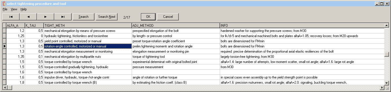Tightening coefficient alphaA and reduction coefficient k tau together with tightening procedure and adjustment procedure can be loaded from the actualized database according to VDI 2230-1:2014.