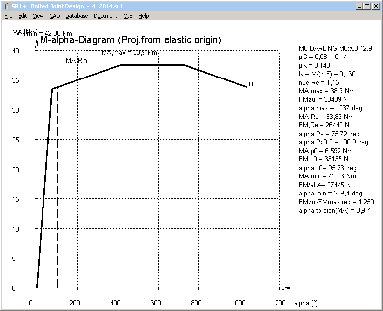 Tightening angle for clamp load and tightening torque beyond yield point can be calculated from the stress-elongation diagram of the bolt material. If a yield point factor nueRe of 1.0 or higher was defined, F-alpha diagram and M-alpha diagram now consider torque angle beyond yield point.