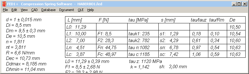 A new column with external coil diameters De1, De2, Dec has been added to the table with spring loads and dimensions at position 0,1,2,n,c. Because the formula for deltaDe in EN 13906 calculates increase of coil diameter on block length Lc only, a formula with variable spring length Lx had to be developed: